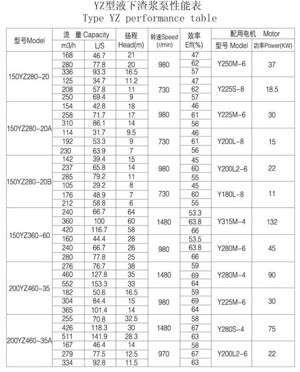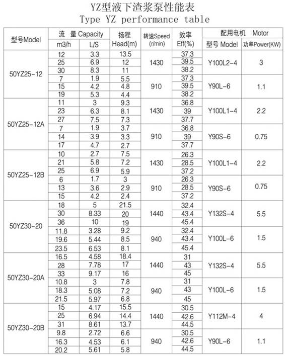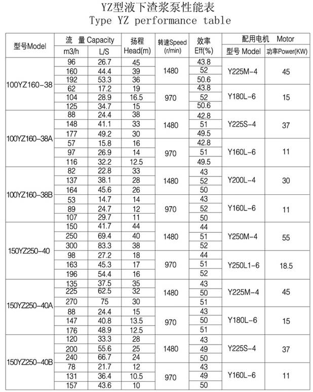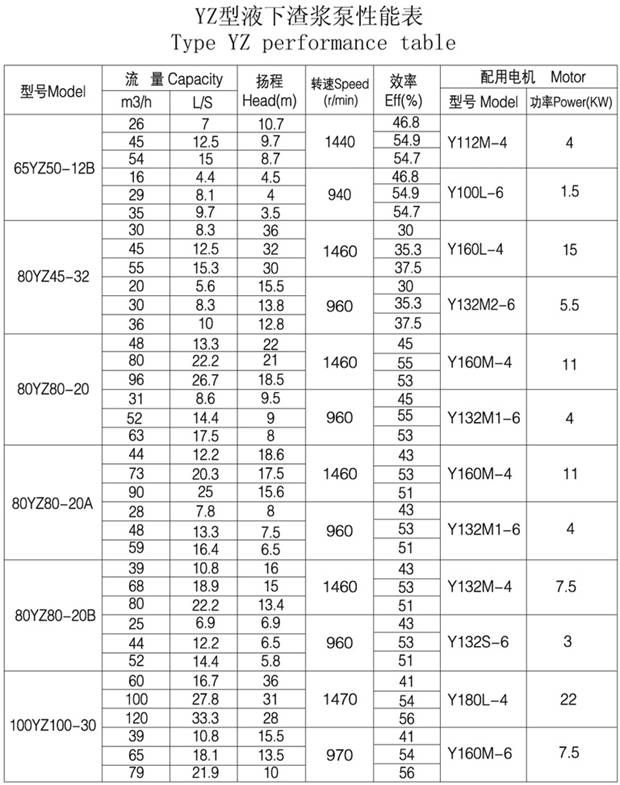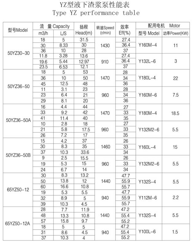 五、YZ液下渣漿泵性能參數(shù)表